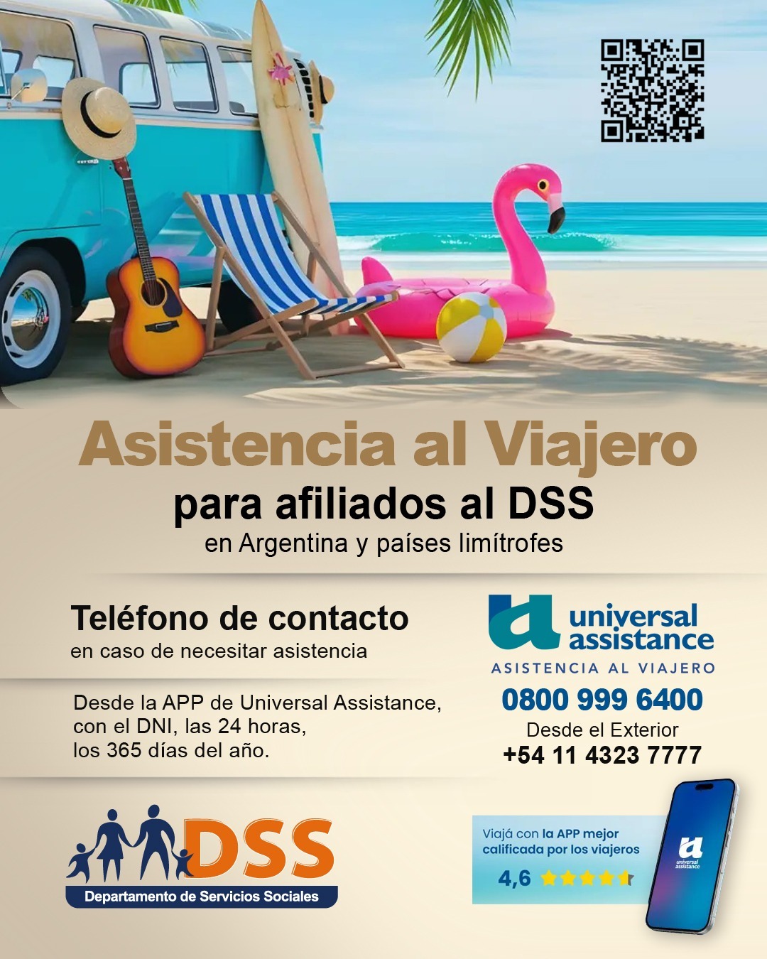 Informamos que los afiliados al DSS cuentan con un servicio de Asistencia al Viajero en Argentina y países limítrofes, contratado a Universal Assistance.