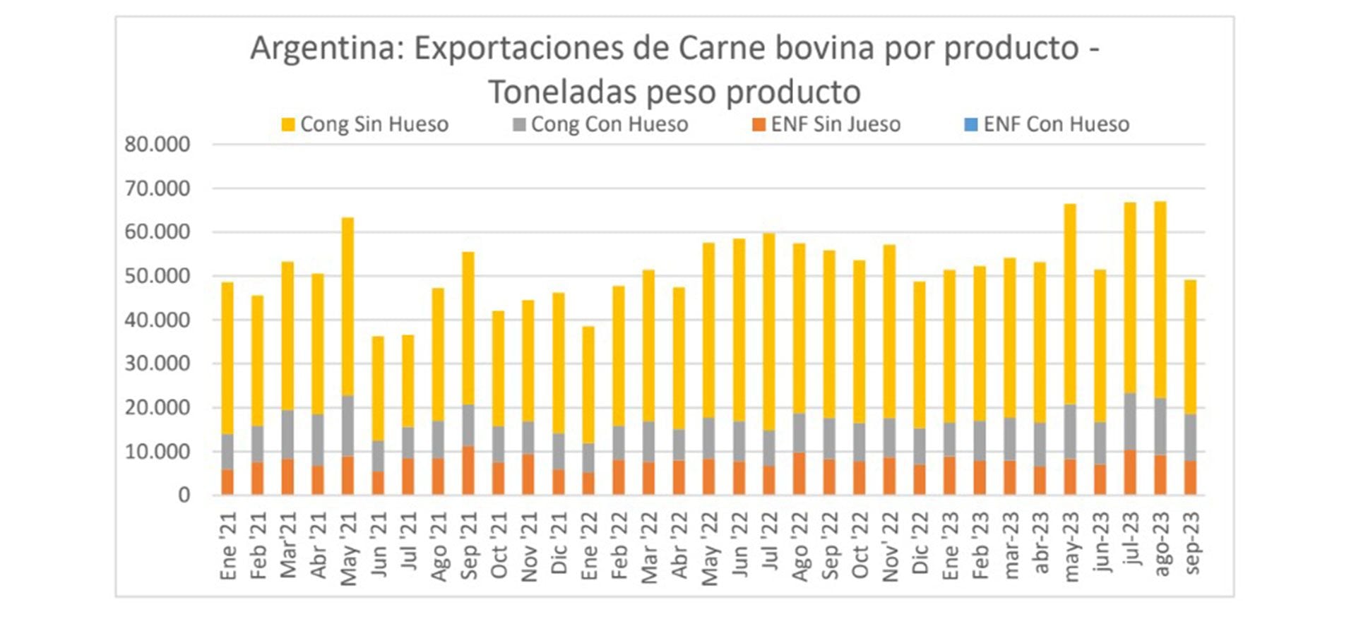 Asimismo, la cámara empresaria destacó que también hubo importantes mermas en los envíos a Estados Unidos, al mismo tiempo que las exportaciones de carne enfriada a Chile se mantuvieron “en niveles históricamente bajos”, ya que de las 1.400 toneladas de septiembre de 2023 muestran una caída del 23,7% con respecto a los envíos del mismo mes del año pasado. “La amplia oferta de producto paraguayo y brasileño a precios más competitivos impacta negativamente sobre los volúmenes abastecidos por Argentina”, finalizó el trabajo.