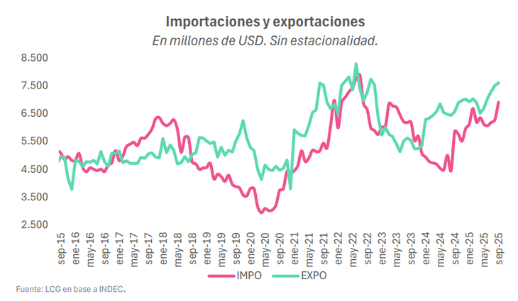En paralelo, las exportaciones encadenaron su quinto incremento mensual consecutivo, al mejorar 1,3% versus agosto. En este caso la serie desestacionalizada también exhibió máximos desde 2022.