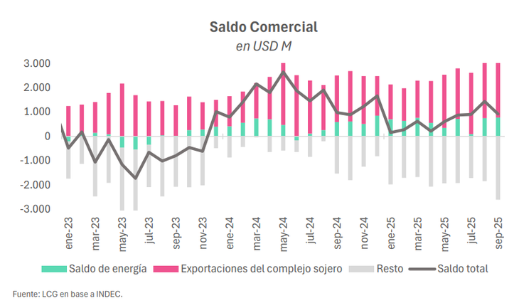 En los primeros nueve meses de 2025, el país tuvo un superávit comercial de u$s6.030 millones, un 40% de la suma alcanzada en el mismo período de 2024. Según LCG, el acumulado de todo este año podría llegar a los u$s7.700 millones, lo cual implicaría una merma anual de 31,3%.