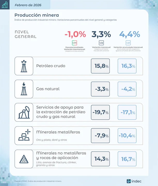El Instituto Nacional de Estadística y Censos (INDEC) dio a conocer este miércoles que la actividad minera creció 3,3% interanual en febrero de 2026 y cayó 1% respecto de enero.