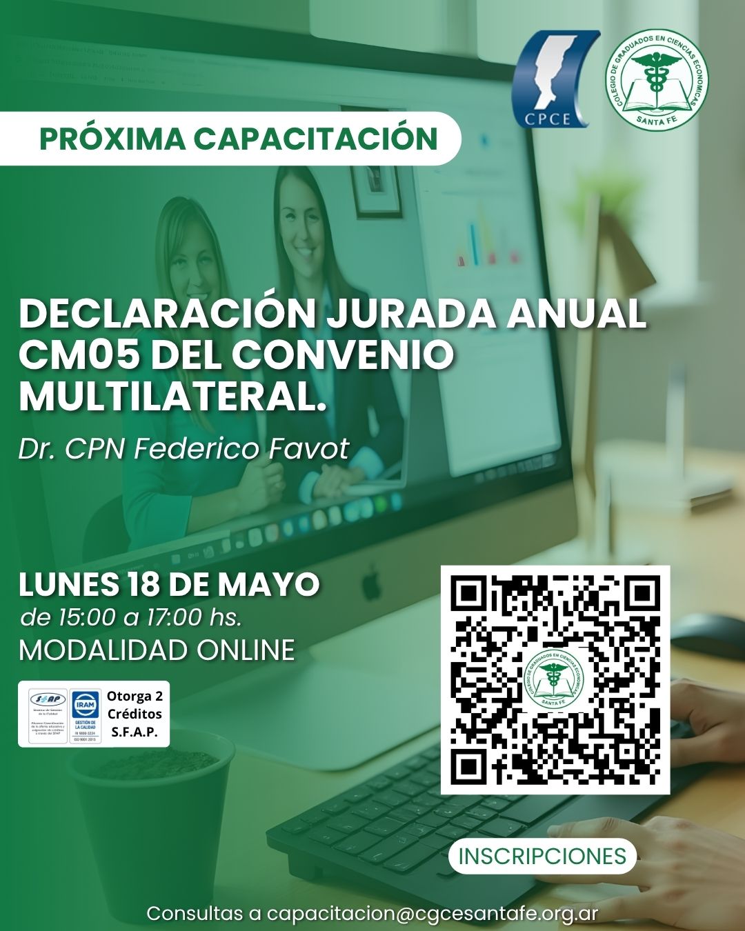 18/05 – 15hs Declaración Jurada Anual CM05 del Convenio Multilateral. Dr. CPN Federico Favot.