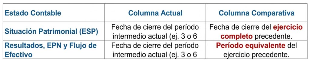 La entidad debe aplicar los mismos criterios de medición y exposición que en el cierre anual, presentando obligatoriamente la información comparativa relevante, salvo que no haya existido obligación legal de emitir estados contables en el período previo o exista una dispensa específica de la norma. La exposición se organiza en dos columnas (Actual y Comparativa) bajo los siguientes criterios:
